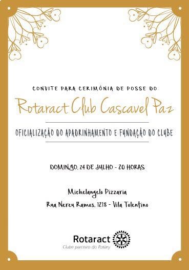O Rotaract Club Cascavel Paz convida todos a participarem da solenidade de Posse da Gestão 2016/2017 e oficialização do apadrinhamento do Rotary Club Cascavel Paz.