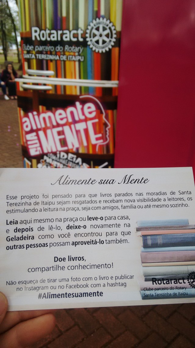 O projeto ALIMENTE SUA MENTE, foi pensado para que livros parados nas moradias de Santa Terezinha de Itaipu sejam resgatados e recebam nova visibilidade a leitores, estimulando a leitura na praça. Os livros estão localizados dentro da geladeira na Praça Silvino Dal Bó, leia na praça ou leve-o pra casa, e depois de lê-lo, deixe-o novamente na geladeira como você encontrou para que outras pessoas possam aproveitá-lo também.