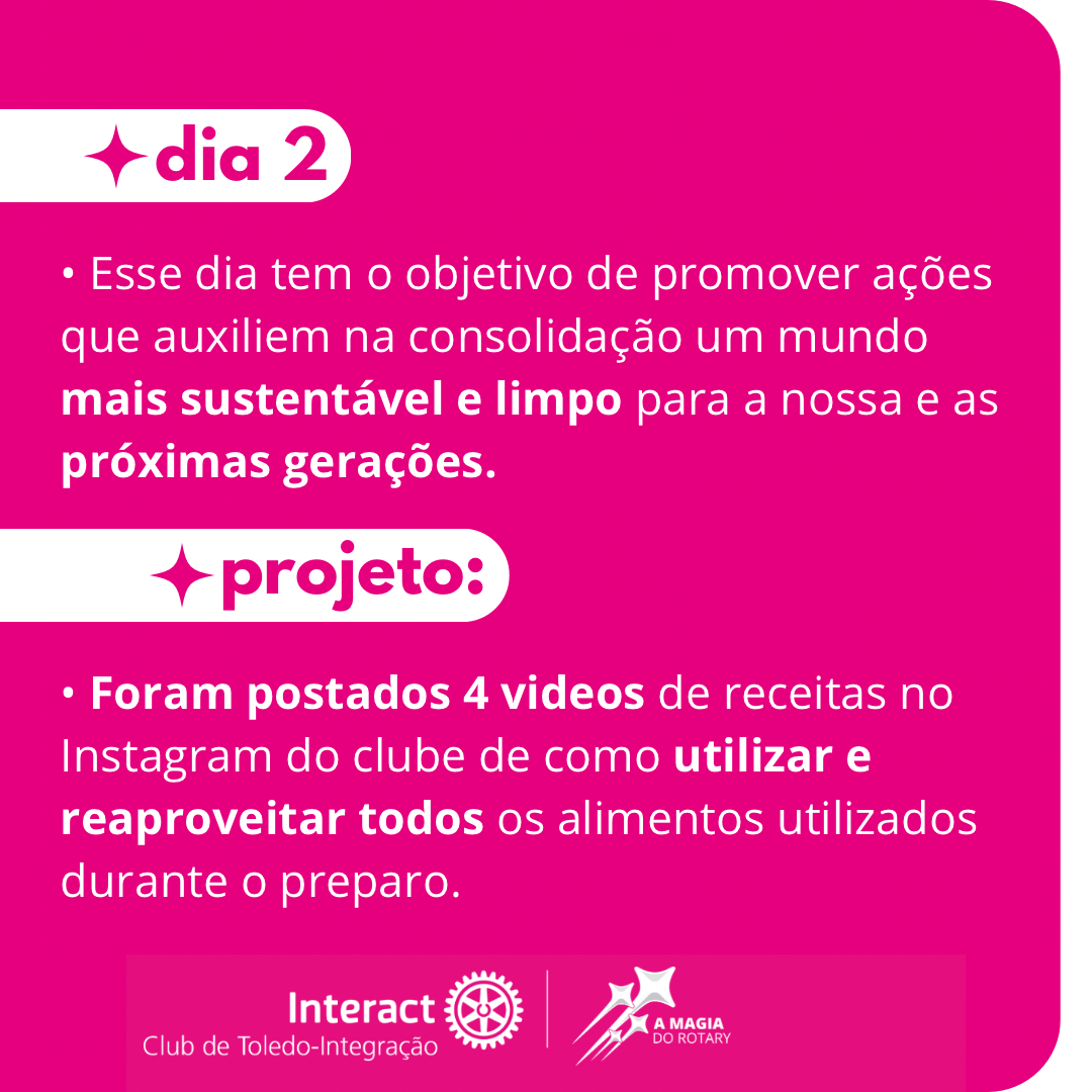 O projeto “Cozinharact” foi idealizado e realizado junto com a avenida de Meio Ambiente, foram postados uma série de vídeos no reels do Instagram do @interactclubtoledo com receitas de como utilizar e reaproveitar todos os alimentos durante seu preparo.