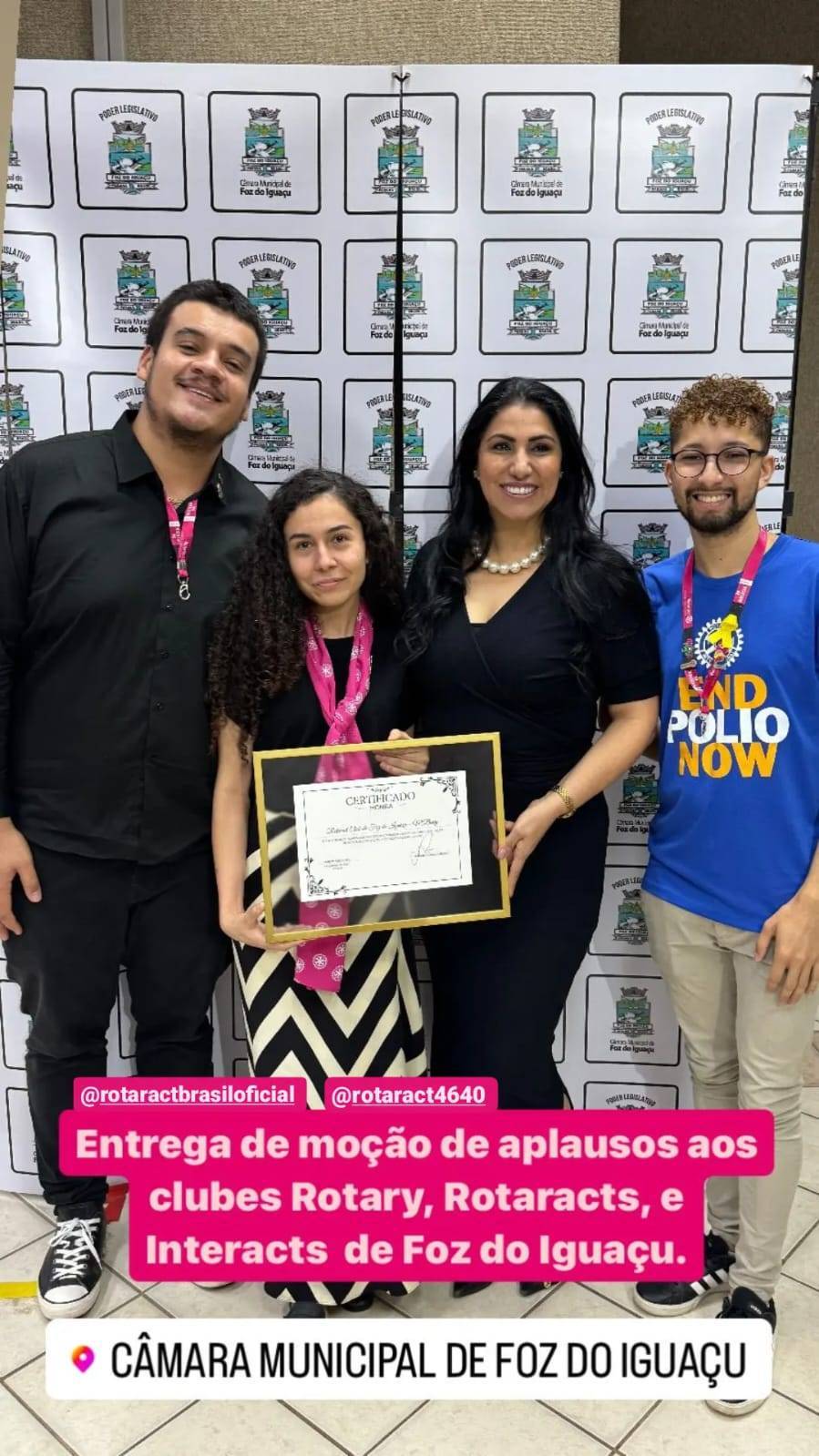 No dia 04 de março de 2024, a vereadora Anice Gazzaoui fez a entrega de uma moção de aplausos para os clubes de Rotary, Rotaract e Interact na Câmara Municipal de Foz do Iguaçu.