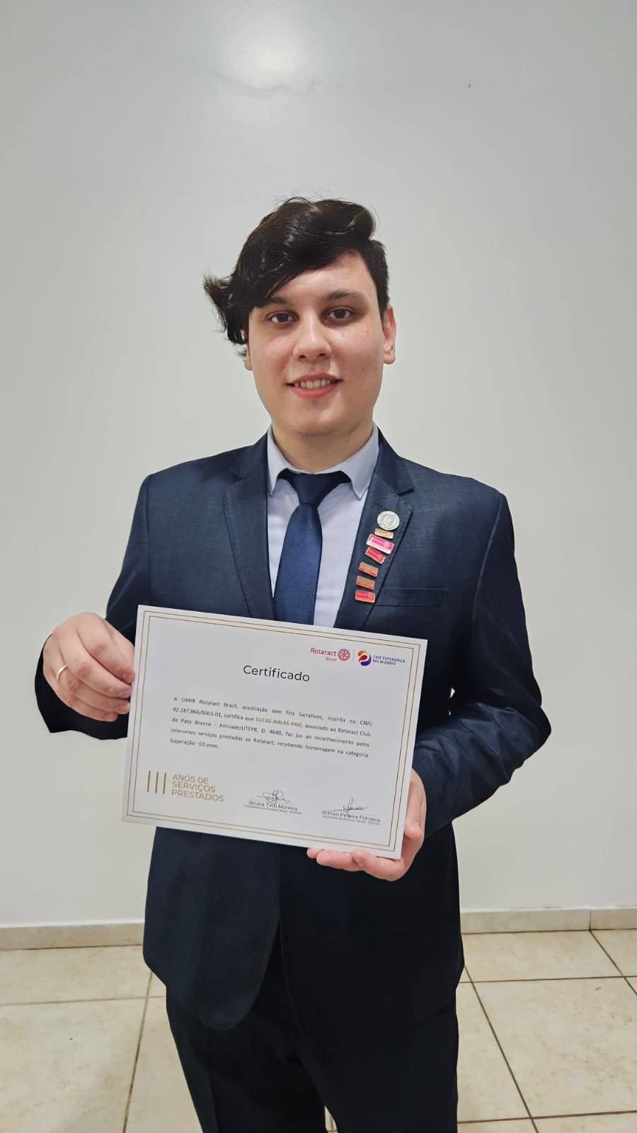 Durante a reunião de transmissão de cargos, realizamos a entrega dos distintivos de reconhecimento por tempo de serviços prestados à família rotária. O companheiro Lucas Halaz Paiz foi homenageado por seus 3 anos de envolvimento e comprometimento. Lucas tem sido um membro dedicado e ativo, sempre pronto para contribuir em nossos projetos. Seu esforço e empenho têm sido essenciais para o sucesso de nossas iniciativas. Agradecemos a Lucas por seu excelente serviço e dedicação!
