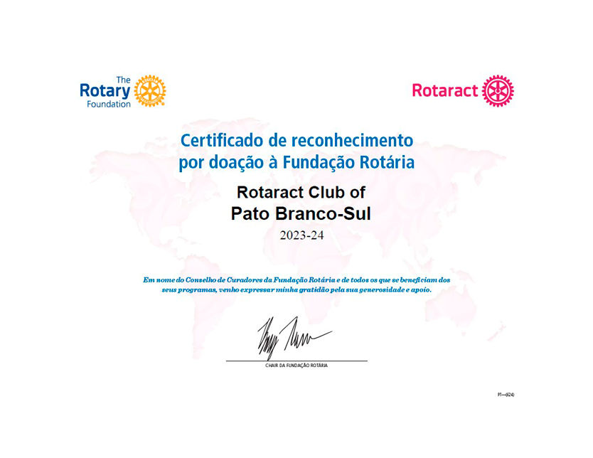 Nessa última semana, o Rotaract Club de Pato Branco - Sul recebeu com grande orgulho o Certificado de Reconhecimento da Fundação Rotária, do Rotary Internacional. Este certificado é concedido aos clubes de Rotaract que, ao longo do último ano rotário, realizaram doações de, no mínimo, $100 dólares rotários.