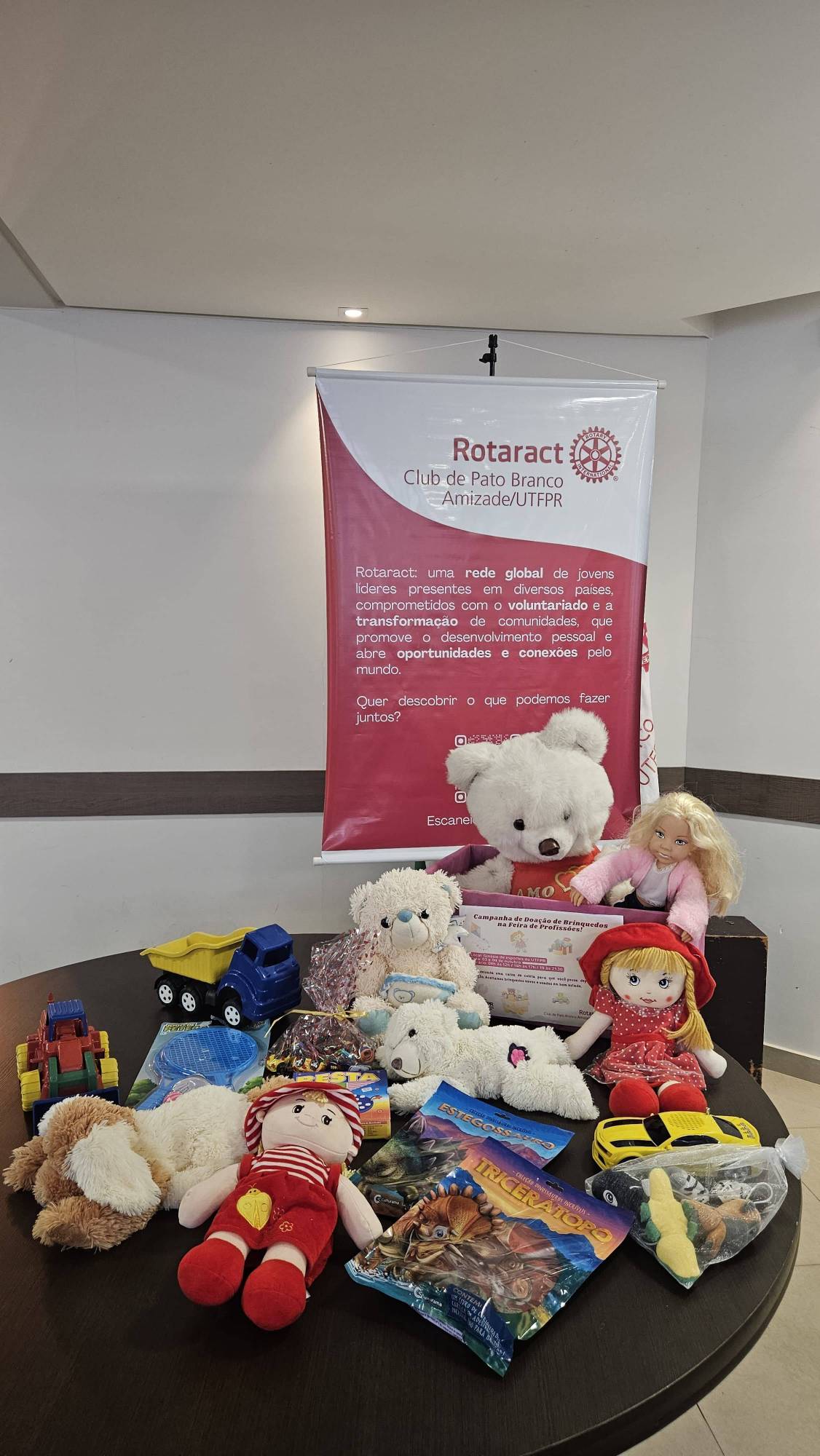 O Rotaract Club de Pato Branco Amizade/UTFPR realizou uma campanha de arrecadação de brinquedos durante a "Feira de Profissões" na UTFPR nos dias 3 e 4 de outubro, visando coletar doações de brinquedos novos e usados (em bom estado) para crianças carentes. Arrecadamos cerca de 11 brinquedos nesses dois dias de eventos, além disso, o Rotakids Club de Pato Branco Amizade, em uma demonstração de colaboração, também nos repassou uma quantidade significativa de brinquedos arrecadados em sua própria campanha. Com o apoio de todos, totalizamos aproximadamente 65 brinquedos, que foram cuidadosamente selecionados para atender às necessidades das crianças da escolas municipais dos bairros Alvorada e São João, áreas carentes da cidade. Essa ação evidenciou a força da solidariedade e a capacidade do Rotaract se unir a outros grupos em prol de um objetivo maior.