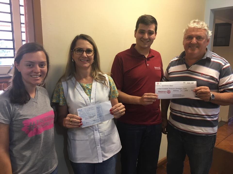 No dia 27 de Julho os rotaractianos de Palotina efetuaram a entrega de doações à duas instituições de ensino, o Colégio Estadual Domingos Francisco Zardo e a Escola Rouxinol, as quais haviam solicitado auxílio para melhorar o atendimento aos alunos.