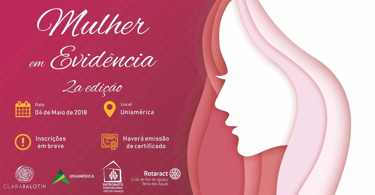 O Rotaract Club de Foz do Iguaçu Terra das Águas, juntamente com o Patronato Penitenciário de Foz do Iguaçu e a Uniamérica, estão promovendo o evento Mulher em Evidência, que contará com palestras sobre saúde da mulher e assédio no trabalho.
